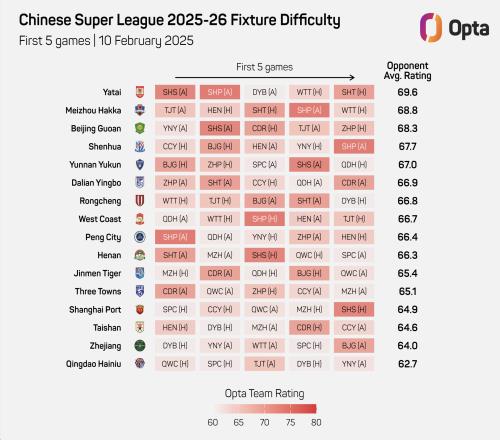 69.6 v 62.7- 根据Opta大数据模型,2025赛季中超联赛前5轮比赛赛程