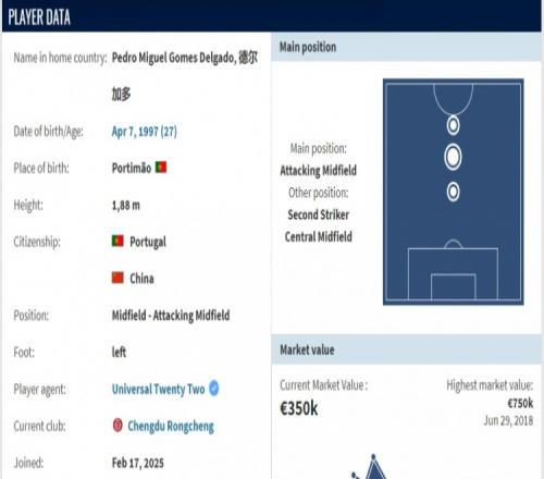 体育资讯2月17日报道宣称 《转会市场》显示,山东泰山队归化球员德尔加多租借加盟成都蓉城,租借费为92万欧元,约合人民币700万元。