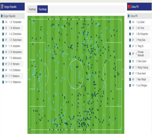 国青(深蓝)半场12次攻入对手禁区,吉尔吉斯斯坦在国青禁区内仅3次触球