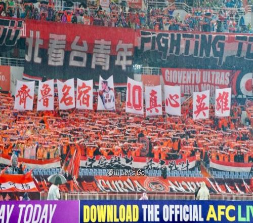 在今晚山东泰山主场对阵光州FC的比赛中,山东球迷打出标语欢迎宿茂臻回归:“齐鲁名宿,真心英雄”。