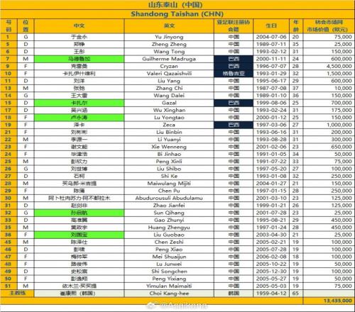 山东泰山2024/25赛季亚冠精英联赛报名名单: