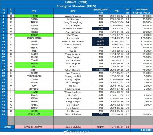 上海申花队202425赛季亚冠精英联赛报名名单第3报名窗口