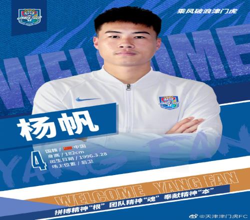 体育资讯1月26日报道宣称 今天午间,天津津门虎俱乐部官宣后卫杨帆的回归。翻看津门虎的官方微博,这已经是球队第四次官宣杨帆的加盟。