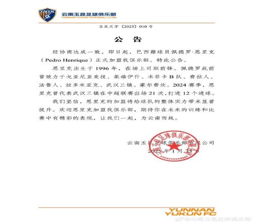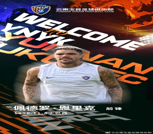 体育资讯1月25日报道宣称 中超升班马云南玉昆俱乐部官方宣布,前武汉三镇外援佩德罗-恩里克正式加盟。