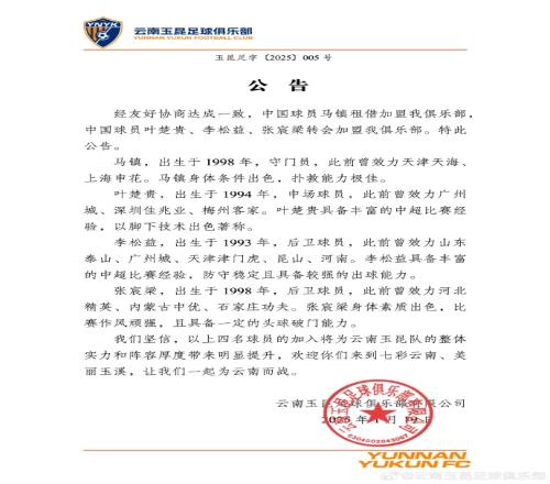 体育资讯01月19日报道宣称 云南玉昆官方消息,连签4名新援,马镇、叶楚贵、李松益、张宸梁加盟球队。