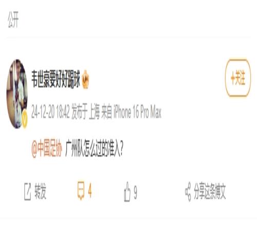 足协2024年12月20日公布第二批完成债务清偿俱乐部名单仅仅几分钟后,韦世豪就在个人微博发文,并@中国足协:“广州队怎么过的准入?”