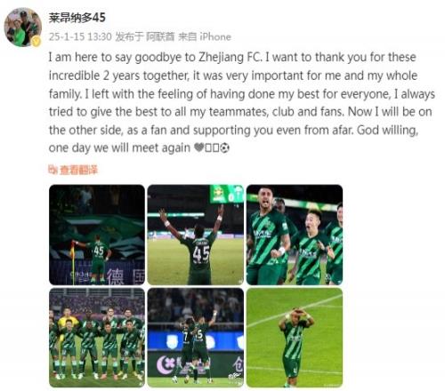 体育资讯1月15日报道宣称 今天,莱昂纳多更新社媒,向自己效力了两个赛季的浙江队告别。