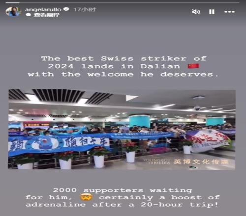 Angela Rullo在社媒晒出了大连球迷接机马莱莱的照片,并配文写道:“2024年最出色的瑞士前锋抵达大连,收获热烈欢迎,他完全值得这样的欢迎。现场有2000名球迷等待着他的到来,在经历20个小时的长途飞行后,这场景让人心潮澎湃!”