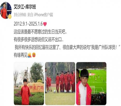 艾沙江-库尔班在社媒写道:“2012.9.1-2025.1.6。这应该是最不愿意过的生日当天吧,有很多很多话想说,但又说不出口,我所有快乐的回忆留在这里了,很自豪大声的说句:‘我是广州队球员!’有缘再见。”