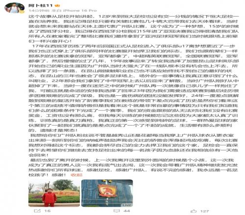 最后也到了离开的时候,上一次我离开这里到外面闯的时候是个小孩,这一次我成为了真正的男人,这一次我有底气出去闯,这一次我会带着广州队精神继续发光发热。感谢你们所有球迷,感谢足校,感谢广州队,有说不完的感谢,我永远是一名足校孩子!感谢!