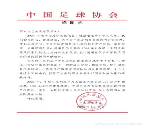 2025年1月6日,中国足球协会向石家庄功夫足球俱乐部致感谢函,对俱乐部在2024年度对各级U系列成年男足国家队的支持和帮助表示感谢。