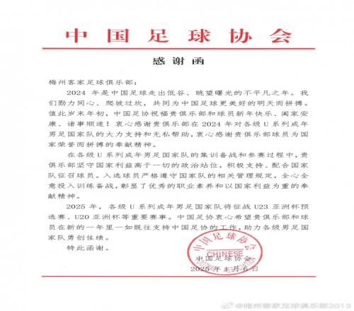 2025年1月6日,中国足球协会向梅州客家足球俱乐部致函,感谢俱乐部在2024年度对U系列成年男足国家队的支持与帮助。