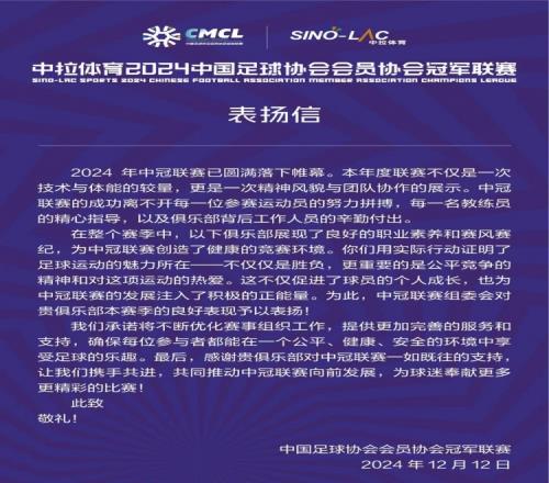 足协官方:因赛风赛纪表现良好,特向27家中冠俱乐部发表扬信