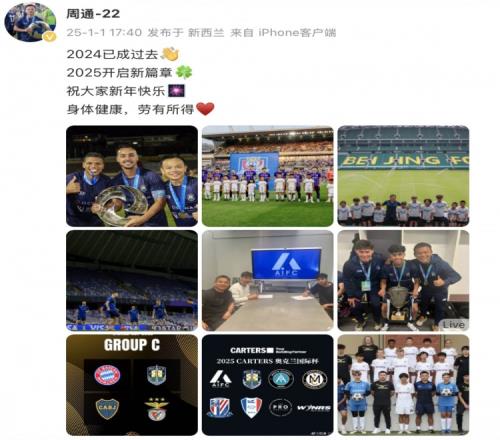 周通在社媒晒出了2024年度的多张照片,在这一年他帮助球队获得了新西兰全国联赛、大洋洲冠军联赛等冠军,还带领着奥克兰城的青训梯队前往中国参加活动,促进了两国青少年之间的交流。2025年,他还将代表奥克兰城参加FIFA洲际杯赛事。他在社媒配文写道: