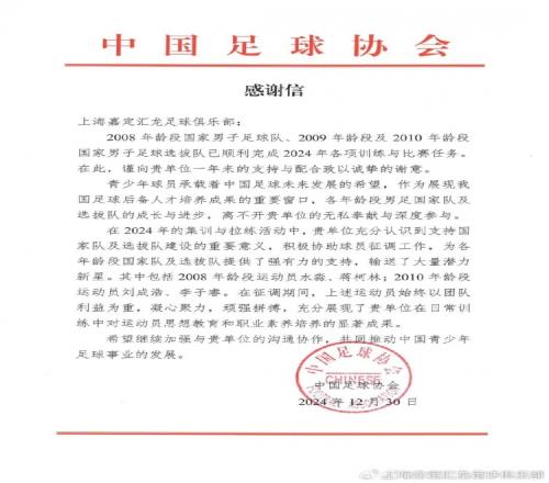 12月30日,上海嘉定汇龙足球俱乐部收到来自中国足球协会的感谢信,感谢我俱乐部对各级国家队及选拔队的集训、备战及比赛工作的支持。信中肯定了我俱乐部在青少年球员培养方面的工作,也对入选各级国家队及选拔队的四名队员在队期间的训练态度表示了认可。