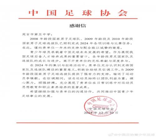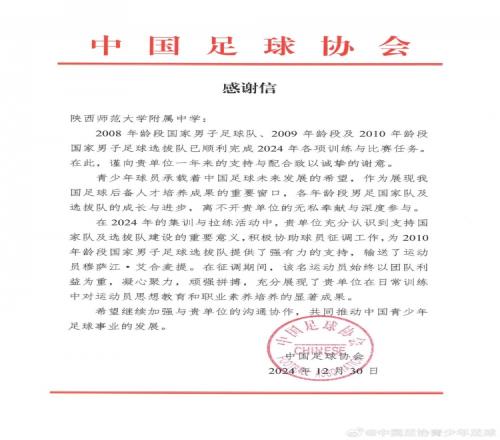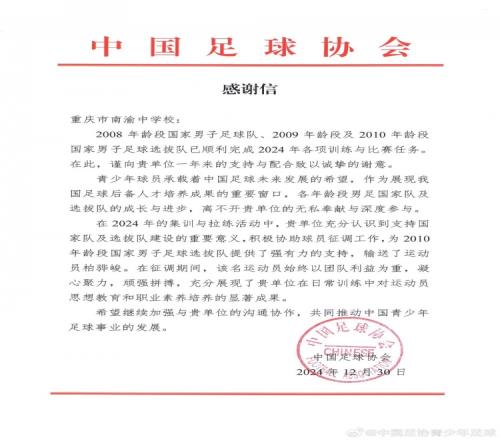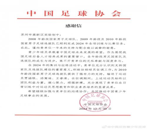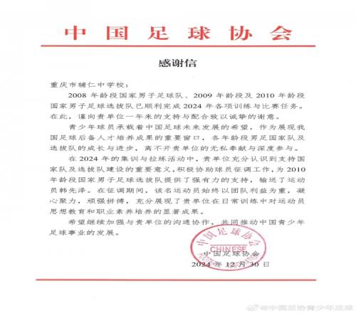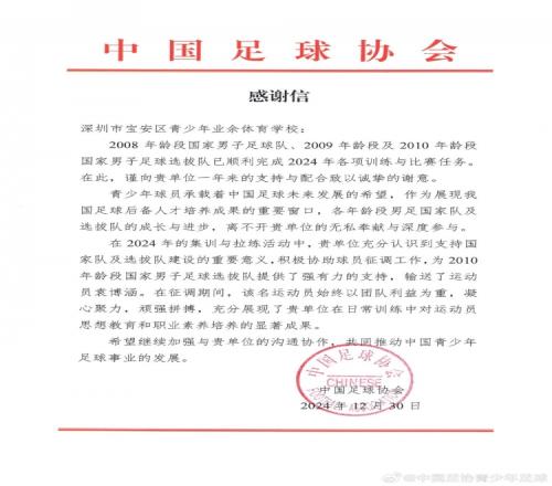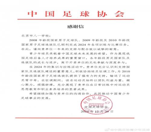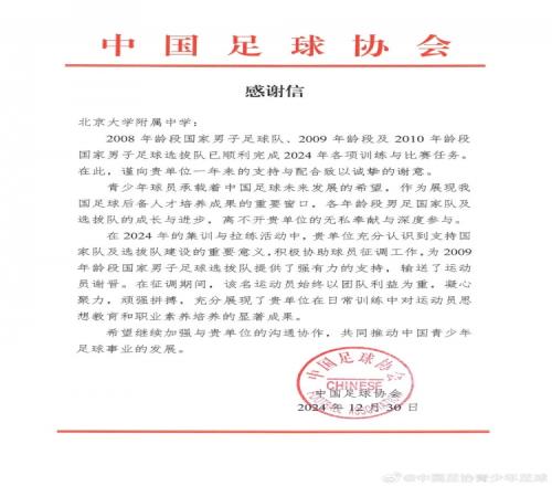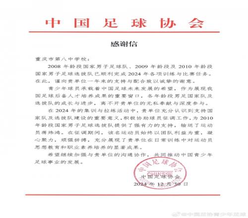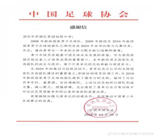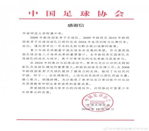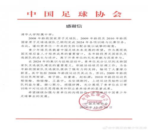 2008年龄段国家男子足球队、2009年龄段及2010年龄段国家男子足球选拔队已顺利完成2024年各项训练与比赛任务。在此,谨向北京大学附属中学、北京市八一学校、长沙市雅礼外国语学校、重庆市第八中学校、重庆市辅仁中学校、重庆市南渝中学校、华南师范大学附属中学、清华大学附属中学、陕西师范大学附属中学、上海市杨浦区青少年业余体育学校、深圳市宝安区青少年业余体育学校、深圳市罗湖区翠园初级中学、苏州市高新区实验初中、苏州市吴县中学、延吉市第五中学等单位一年来的支持与配合致以诚挚的谢意。