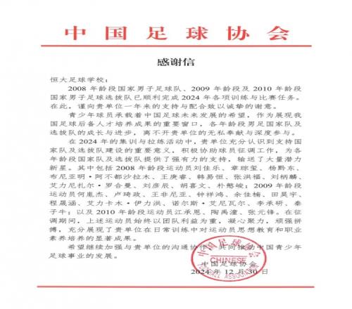 2024年12月31日,恒大足校收到中国足协发来的《感谢信》,对我校为国家队输送了大量潜力新星及输送球员们良好的团队精神和职业素养给予了高度肯定。