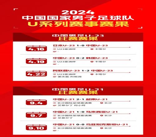体育资讯12月30日报道宣称 在2024年行将结束之际,中国足球队官方发布了中国男足U系列国字号队伍今年的成绩回顾。