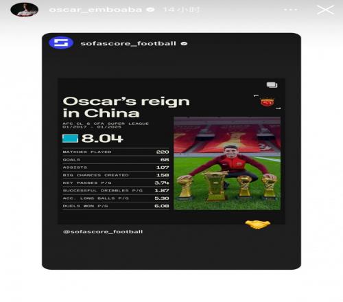 奥斯卡晒中超生涯sofascore评分:场均评分过8场均关键传球3.74