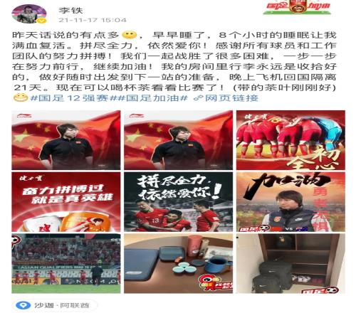 据不完全统计,李铁任国足主帅期间共发布近30条宣传微博,涉及健力宝、李宁、茶叶等个人代言,把微博变成了大型广告植入现场。整个12强赛期间,他一直没有停止“带货”。一位足协内部人士透露,实际上在12强赛进行期间,国家队方面就曾多次向李铁强调注意言行,李铁的回答都是“知道了”,但收效甚微。