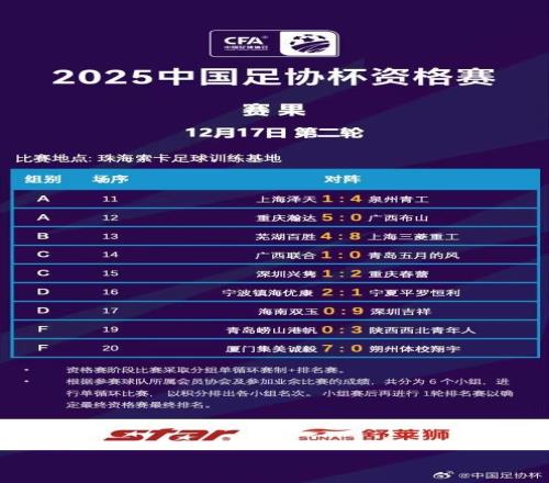 体育资讯12月17日报道宣称 今天进行了足协杯资格赛第二轮的比赛,其中深圳吉祥9-0狂胜海南双玉,上海三菱重工8-4大胜芜湖百胜,厦门集美诚毅7-0大胜朔州体校翔宇。