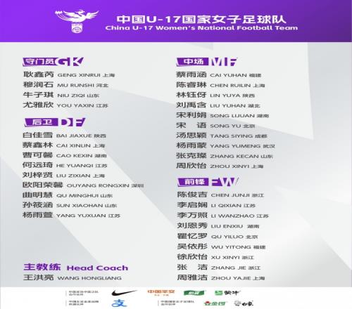 U17女足集训名单:王洪亮担任主帅,张克璨、周欣怡在列