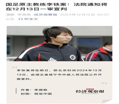 体育资讯12月12日报道宣称 近日足坛反腐案接连宣判,戚军、谭海、刘奕、刘刚先后获刑,三天连判四人。经济观察报记者李微敖报道,李铁案将在明天进行宣判。