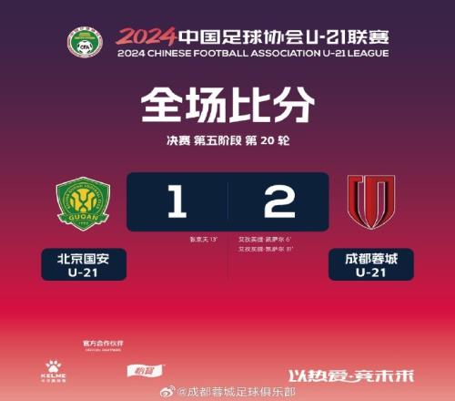 小将艾孜买提梅开二度,成都蓉城U21队21战胜北京国安U21队