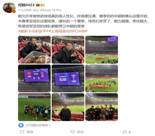 何胜晒出在现场观战的照片,同时配文:“能允许带食物进球场真的很人性化,好感度拉满,赛季初的中超联赛从这里开始,本赛季亚冠在这里结束,漫长的一个赛季,球员们辛苦了,能力越强,责任越大,希望进军亚冠的球队都能捍卫中超的荣誉。”