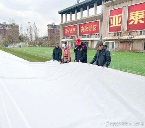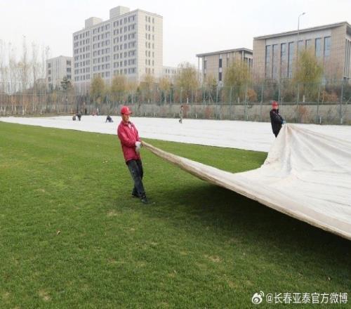 立冬已至,气温骤降,亚泰足球净月基地也到了给小草坪“盖被”的时候。本周,基地草坪养护工人把缝制好的白色“棉被”盖在了6块天然草坪上,确保他们能够度过长春的冬天,待到明年春花烂漫时,伸伸懒腰,以翠绿的新颜迎接亚泰将士。