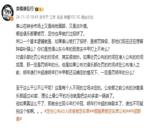 中超赛季结束,有关俱乐部涉及假赛的处罚很可能即将出炉。博主“卖萌谁在行”透露,泰山正积极地在转会市场进行运作。