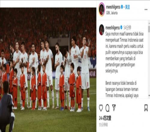 在个人社媒,希尔格斯写道:“我很抱歉现在无法帮助印尼队,因为我完全恢复还需要时间,以便在接下来的比赛展现最佳水平。作为印尼队的球员,无法为球队出战很难受,尤其是我还没有感受过印尼主场的氛围,但我会一直支持球队。希望印尼队能在这两场比赛拿到分数。”
