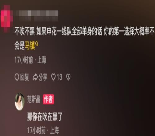 有网友在评论区评论:不吹不黑,如果申花一线队全部单身的话,你的第一选择大概率不会是马镇