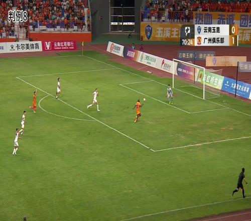中甲联赛第19轮,云南玉昆VS广州俱乐部,比赛第71分钟,云南玉昆30号队员进球,裁判员判进球有效。