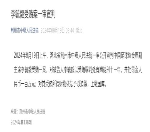 2024年8月19日上午,湖北省荆州市中级人民法院一审公开宣判中国足球协会原副主席李毓毅受贿一案,对被告人李毓毅以受贿罪判处有期徒刑十一年,并处罚金人民币一百万元;对其受贿所得财物依法予以追缴,上缴国库。
