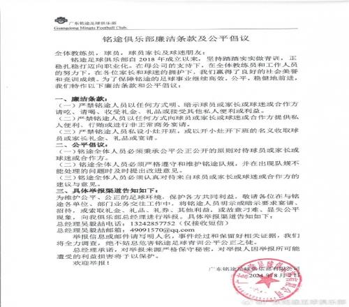 为此我们特向社会发布《铭途俱乐部廉洁条款和公平倡议》,欢迎各位家长、球迷和社会各界一同监督,发现以上问题可以直接联系铭途总经理。我们绝不姑息此类违规违法行为!
