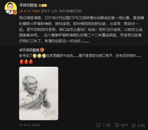 体育资讯8月13日报道宣 今天是足球评论员李元魁过世三周年的日子,詹俊更新社媒表达追思之情。