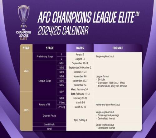 新赛季亚冠精英联赛进行了重大变革,首次采用“联赛阶段”赛制,取代原有的小组赛。每支球队将在联赛阶段与8支不同的球队进行4主、4客的对决。
