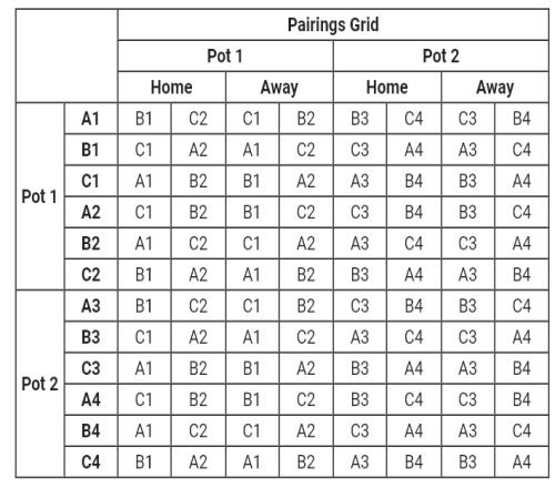 东西亚半区,对应的球队将被分入对应抽签网格中的编号,以西亚区为例,第1档俱乐部占据网格前两行的编号(A1-C2),第2档俱乐部占据底部两行的编号( A3-C4),每支球队与八个不同俱乐部进行比赛(比如A列俱乐部将分别与B列、C列俱乐部进行配对)。