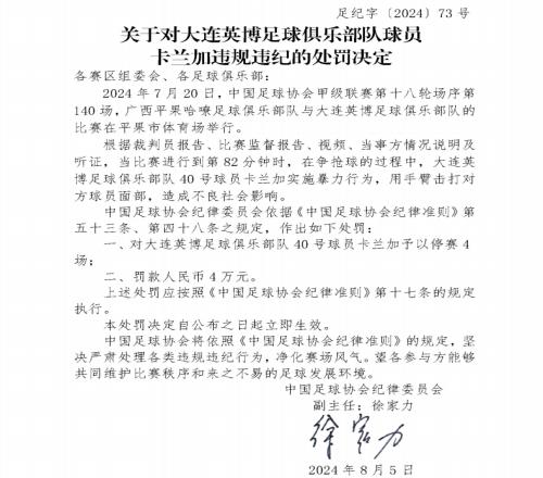 体育资讯08月07日报道宣 足协官方:大连英博球员卡兰加在争抢球过程中实施暴力行为,用手臂打对方面部,停赛4场,罚款4万。