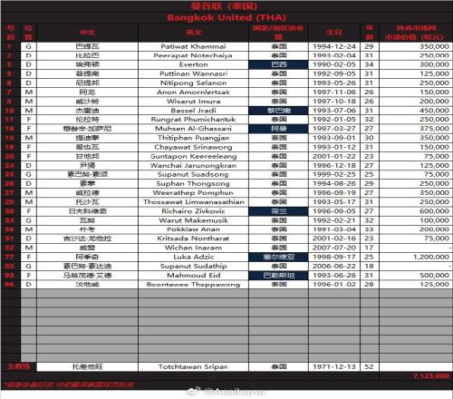 泰山的对手曼谷联名单: