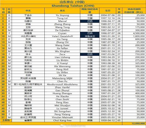 朱艺:山东泰山队亚冠精英联赛附加赛报名名单。球队报满了35人,其中包括4名外援,归化球员德尔加多首次以纯中国球员身份报名,夏窗撤销外援均未获报名。由于一线队U21球员仅有3人,因此补充了7名征战中乙联赛的B队球员名列其中,达到满额(报名要求U21球员至少10人,如不满10人则按数扣减人数上限)。
