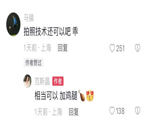 体育资讯08月03日报道宣称 范志毅女儿范斯晶晒街拍照,其男友、上海申花门将马镇留言:拍照技术还可以吧 乖。