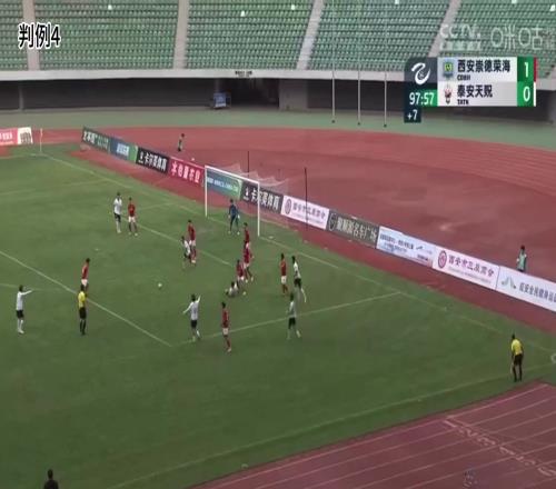 判例四:中乙联赛第18轮,西安崇德荣海VS泰安天贶,比赛第90+8分钟,泰安天贶掷前场界外球,西安崇德荣海防守队员在本方罚球区内与泰安天贶队员有接触,后者倒地,裁判员未判罚犯规。