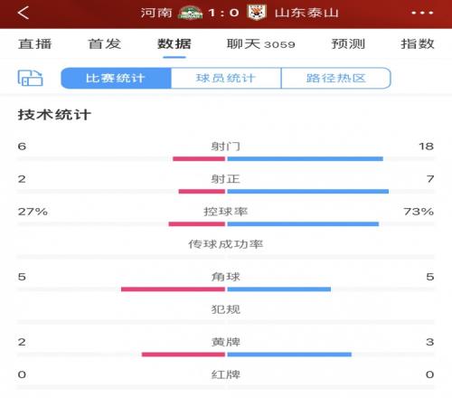 全场数据:泰山射门18控球超7成压倒性优势,河南2射正1进球制胜