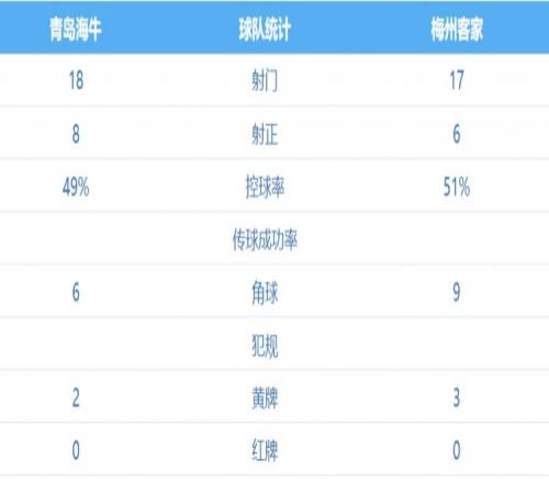 此外,青岛海牛有6个角球,梅州客家有9次角球。