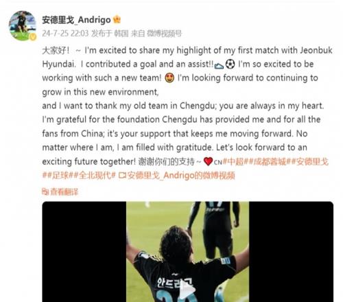 体育资讯7月25日报道宣称 在7月20日进行的K联赛中,全北现代主场2-0击败蔚山HD,本场比赛从成都蓉城租借来到全北现代的安德里戈在第62分钟替补出场,贡献一传一射。赛后,安德里戈在个人微博中发文感谢成都球迷。
