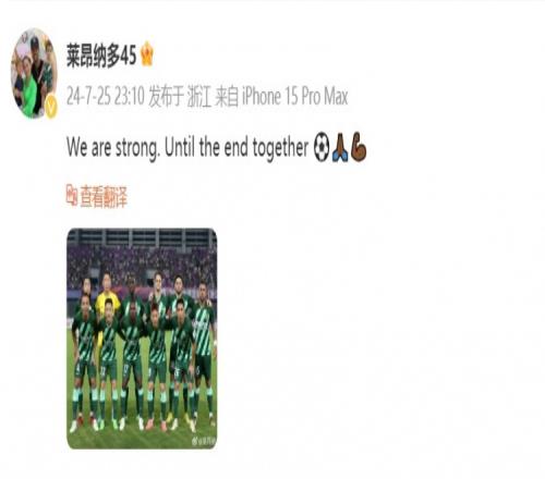 体育资讯7月25日报道宣称 浙江队外援莱昂纳多在个人微博中晒出了全队的合照,并写道:我们很强大,一起战斗到最后。