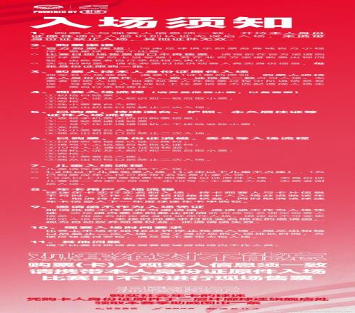 2、持票(年卡)请在北大门西侧接受安检后进入体育场,人、票、证信息必须一致,现场核验身份证入场,无身份证者禁止入场,无票者禁止入场。