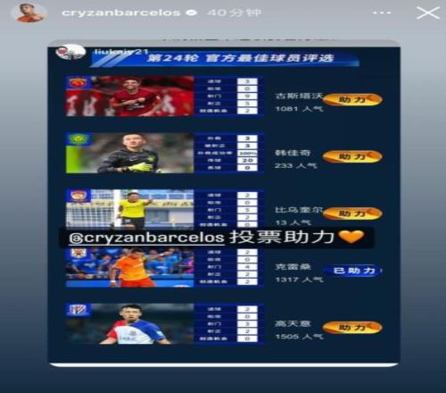 在中超第24轮的最佳球员候选名单中,克雷桑与古斯塔沃、韩佳奇、比乌奎尔、高天意一同入围。克雷桑在社媒转发了一则动态,感谢了泰山球迷为其投票助力。